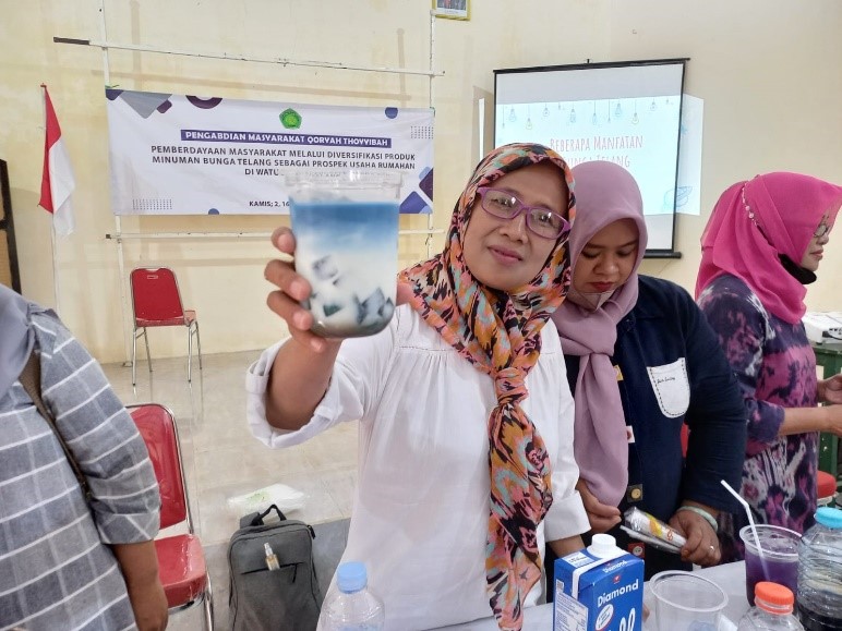 Pelaksanaan tri dharma perguruan tinggi Tim kelompok pengabdian Qaryah Thayyibah mengadakan pelatihan pemanfaatkan bunga telang untuk minuman kekinian. Tim pengabdi dalam kegiatan ini terdiri dari Nuril Huda, M.Pd, Lusty Firmantika, M.Pd, Moh. Mahrush Ali, M.Sn dan disertai dengan dua mahasiswa. Pelatihan ini dilakukan di Desa Watugedhe Kecamatan Singosari Malang pada tanggal 12 Juli 2022. Sasaran pelatihan ini yaitu pada kelompok ibu-ibu PKK dan kader PPK Desa Watugedhe. Target yang di harapkan dari pelatihan ini mampu mewujudkan masyarakat yang mandiri, terampil, dan sejahtera melalui pemanfaatan lingkungan (bunga telang).